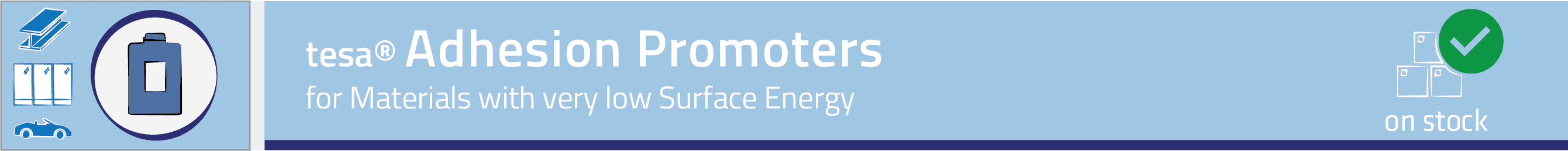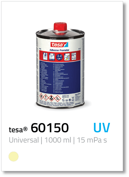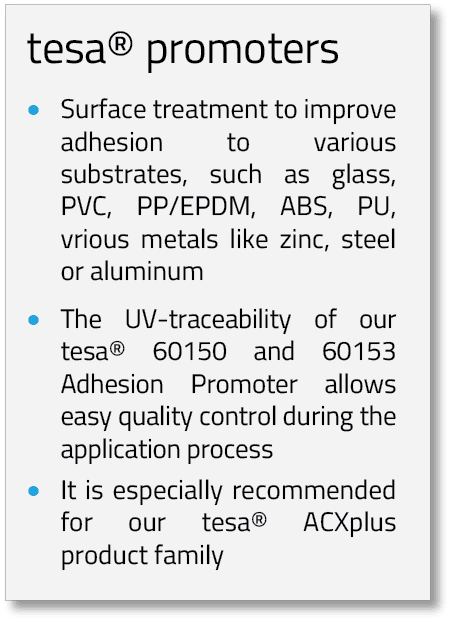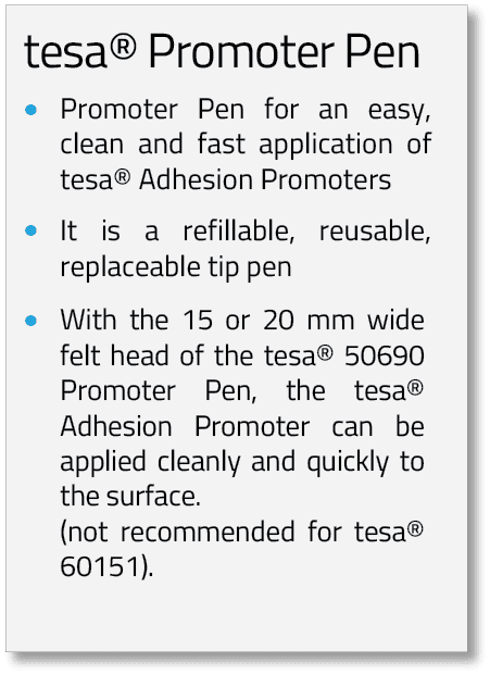 • For bonding – especially outdoors and on surfaces that are difficult to bond – we recommend the use of a bonding agent, like our tesa® Adhesion Promoters. Bonding agents form a layer on the surface to which the pressure-sensitive adhesive adheres particularly well.