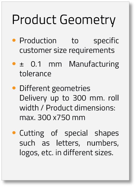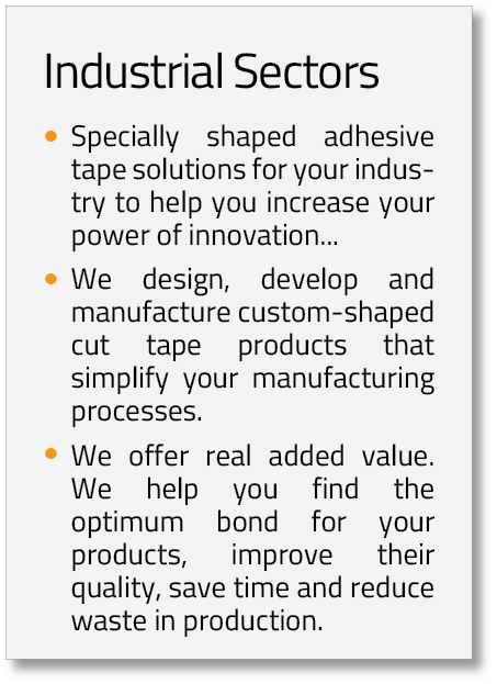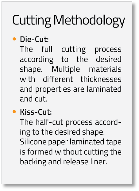 . To meet the increasing demand for special shaped self-adhesive tapes in the industrial sector, they are produced as full cut (die-cut), half cut (kiss-cut), finger lift or laminated (multi-layer) products.